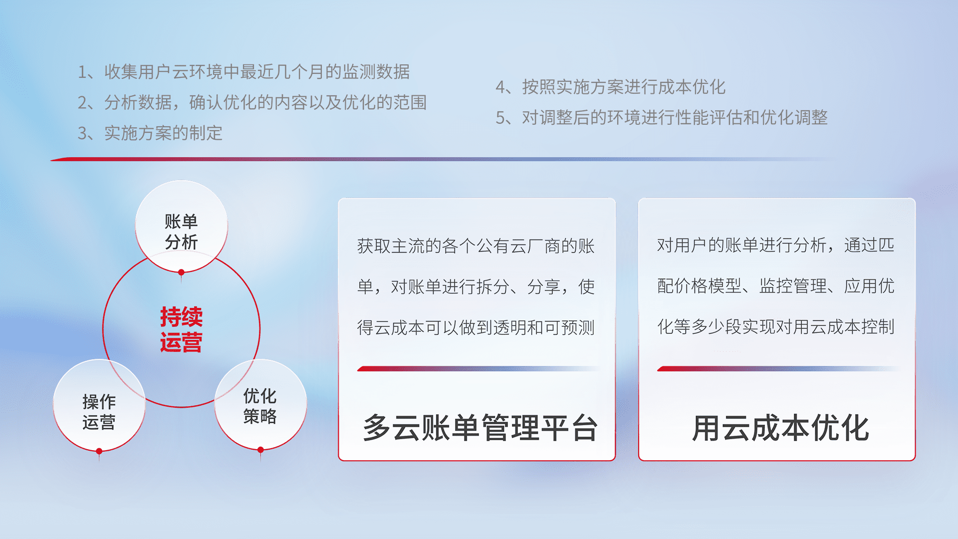 通过多云纳管,,,以统一的资源数据模型把客户的云资源进行抽象和封装,,,,进而实现对多云资源的统一操作,,,,保障云资源管理的可靠性、、、稳定性与可用性。。量身定制化运维内容,,配置、、、、开发运维、、、、补丁管理、、备份、、、、监控、、、、认证和访问管理、、审计和日常巡检等,,保障在用云过程中的可靠度,,,,稳定度以及高可用率。。。。